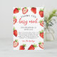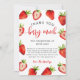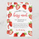 Niedliche und moderne Erdbeeren Thema Mädchen Babydusche Dankeschön-Karte mit Darstellung der Erdbeeren. Im Text steht: "Vielen Dank, dass Sie uns mit Liebe duschen." Die Nachricht dankt den Gästen für ihr Kommen und ihre Geschenke.