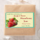 Trio reifer Erdbeeren mit Blätter, die in der links unteren Ecke dieses Etiketts mit einem hellgelben Hintergrund eingebettet sind, umgeben von einem Rand und einem Hintergrund von mitteltürkisfarbenem Grün, was dieses Etikett zu einem perfekten Etikett für die Verwendung auf den Gläsern hausgemachter Erdbeermarmelade oder Konfitüren macht. Der Text befindet sich im Vorlagenformular, sodass Sie ihn auf das ändern können, was Sie möchten.