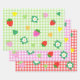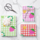 Dieses niedliche und farbenfrohe Verpackungspapier enthält Erdbeeren in Rot und Rosa, weiße Erdbeeren-Blume, dunkelgrüne Blätter und farbenfrohe Lieben in Rot, Rosa, Grün und Gelb. Der Hintergrund ist ein hellgrünes, rosa und rotes Gingham-Muster.