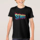A vibrant graffiti-style mural dominates a city street, with the wordword “STREET” painted in bold, three-dimensional letters splashed with vivid blues, yellows, and hot pinks. The artwork bursts with energy, as paint drips and splatters spill onto the pavement, blending rebellion and creativity. Towering skyscrapers rise on both sides, framing the scene and emphasizing the contrast between structured urban architecture and free-flowing street art. The warm glow of the sky in the background adds depth and atmosphere, capturing the raw pulse of city life and the expressive voice of the streets.