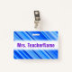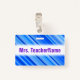 Dieses AbzeichenAusrüstungsbeschreibungen ein Muster der Streifen oder der Linien färbten verschiedene Schatten des Blaus. Es kennzeichnet auch einen kundengerechten Namen im lila farbigen Text innerhalb eines Weiß farbigen Bandes. Ein Abzeichen so konnte von einem Lehrer, von einem Erzieher, von einem Tutor oder von einem Professor während der frühen Wochen eines Schuljahres oder des Kurses möglicherweise getragen werden. Es hülfe möglicherweise den Studenten, an den Namen ihres Lehrers zu lernen und sich zu erinnern. [~Z0000175]