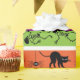 Sammlung von bunten Halloween-Symbolen in gestreiften geometrischen Mustern.