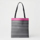 Diese Tasche wird mit einem unterhaltsamen Schwarz/Weiß gestreiften Print-Design mit einem Hot Pink Farbtafel gezeigt. Mittlere Größe angezeigt. Hat schwarze Gurte. Passen Sie dieses Objekt an oder kaufen Sie es wie geplant.