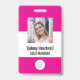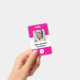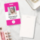 Dieses Abzeichen weist einen trendigen, hellrosa Hintergrund auf, geteilt durch einen massiven weißen Block. Passen Sie es mit Ihrem quadratischen Foto, Namen, Jobtitel, Logo, Firmenname, Adresse oder anderen Informationen an, und können Sie optional Barcode verwenden.