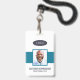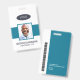 Ein modernes und einfaches Abzeichen, das nicht von den wichtigen Details ablenkt. Leicht zu lesen aus der Ferne. Fügen Sie ein individuelles Logo und Firmendetails hinzu. Fügen Sie den Namen, das Foto und den beruflichen Titel des Mitarbeiters hinzu. Die Bar der Farbe kann so angepasst werden, dass sie den offiziellen Farben des Unternehmens entspricht. Fügen Sie auf der Rückseite weitere Informationen hinzu, wie z. B. die Rücksendeadresse und die Mitarbeiternummer. Ideal für ovale Logos.