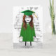Niedliches Strichmädchen mit langen Haaren, Abschluss-Diplom, Sneakers, grüne Mütze und Gown für Graduate Gratulationen.