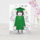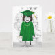 Niedliches Peitschmädchen mit Haar, Abschluss Diplom, grünes Gewand, Perlenhalskette, Sneakers und Kappe für Graduierte Glückwünsche.