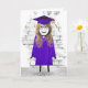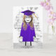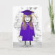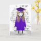 Niedliches Peitschmädchen mit langen blonden Haaren, Abschluss Diplom, lila Kleid, Sneakers und Kappe für Graduierte Glückwünsche.