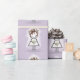 Niedliches Sneakermädchen, weißer Bridalschleier, Spitzenkleid, Haar, Perlenhalskette und ein stumpfes Bouquet für ein Brautparty auf lila. Die Hintergrundfarbe kann geändert werden.
