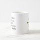 Niedliches Strichmännchen mit einer grünen Kaffeemaschine, Tasse, Haar und Perlenhalskette auf weißem Hintergrund. Zitat ist bearbeitbar.