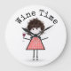 Niedliches Stickermädchen mit Haar, Gingham Kleid, Turnschuhen und Rotwein in Edelstahlglas auf weißem Hintergrund. Die weiße Hintergrundfarbe kann geändert werden. Text kann bearbeitet oder gelöscht werden.