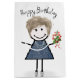 Niedliches Strichmännchen mit Haar und einem Blume-Bouquet mit Sneakern und einem blauen Denim-Kleid auf weißem Hintergrund. Die Hintergrundfarbe kann geändert werden. Text ist bearbeitbar.