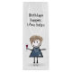 Niedliches Strichmännchen mit Haar, Sneakers, blaues Denim-Kleid, Perlenhalskette und mit einem Glas Rotwein auf weich weißem Terrazzo Hintergrund. Der Hintergrund kann geändert werden.