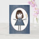 Niedliches Strichmännchen mit Haar, Sneakers, blaues Denim-Kleid, Perlenhalskette und stumpfes Bouquet auf blauem Denim-Hintergrund.