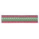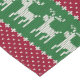 Es ist ein gewebter Pullover-Look - in einem Druck! Ein reich detailliertes Muster mit weißen Rentieren, die über ein grünes Feld ragen, umgeben von einem Weihnachtsrot mit weißen Verzierungen.