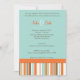 Stripte orange und blaue Babydusche Einladung. Das Design zeichnet sich durch moderne Streifen in auffallenden Orangen, Blues, Braun und Weiß aus.