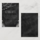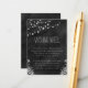 © Sunny Mars Designs. Zeichenkette Schwarzer Halbpension Vertikale Wunschkarten - Moderne, elegante, trendige, schicke, anpassbare formelle 2,5" x 3,5" Hochzeitskarte mit einem schönen schwarzen Chalkboard-Design mit Glühbirnen aus Seil oder Saitenleuchten, die oben mit einem floralen tropischen Design hängen.