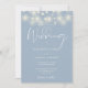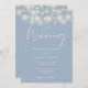 This elegant script dusty blue wedding invitation, featuring pretty string lights, can be personalized with your information in chic typography with your wedding website details and your QR code on the reverse. Designed by Thisisnotme©