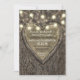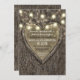 String Lights + Oak Tree Barke Wedding Einladungen - mit einem geschnitzten Herz, Lichtern an der Saite und winzigen, an der Spitze verstreuten binkligen Lichtern. Im Hintergrund befindet sich ein Baumrinde-Hintergrund.