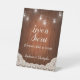 Liebe ist süß, bitte nehmen Sie ein großartiges! Unterschreiben Sie, um Hochzeitsgäste anzuweisen, eine köstliche oder niedliche Gastgeschenk Hochzeit, Dessert oder Süßigkeiten Leckerei zu nehmen. Vintage String Lights Mason Jar Lace Wood Wedding Design. Vintages String Lights Mason Jar Lace Wood Theme hat den Charme und den Charakter einer Sommernacht im Freien. Weiche Beleuchtung und Vignettenrahmen mit Ecru-Creme-Spitze tadellos und glänzende Gläser an einer Saite hängen. Perfekte Ergänzung zu einer eleganten rustikalen Saitenlichter thematische Hochzeit. String Lights Rustic Wood Script Guest Book Pedestal Signage