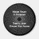 Ein Slogan-Kühlschrankmagnet. Vertraue niemals einem Physiker, sie werden dich einfach binden - in Weiß über einem schwarzen Loch aus Saite gedruckt. Perfekt für Physiker, Physiker, Student oder Lehrer.