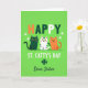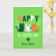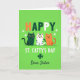 Designed with a bright lime green background, this St. Patrick’s Day illustration puts the phrase “HAPPY ST. CATTY’S DAY” right at the top in a mix of orange, deep emerald, and white letters 💚. Just below the headline, three cartoon cats line up shoulder to shoulder like close friends posing for a photo, their simple faces turned forward with rosy cheeks and easy smiles. On the left sits a dark green cat with bright yellow eyes, looking calm and quietly pleased beside the others. In the middle, a white cat has small green spots and a striped tail that curls slightly, as if it’s brushing the orange cat next to it in a gentle, familiar way. The right cat is orange, warm in color and neatly echoing the orange used in the title, giving the trio a cozy, together feel ☘️. Small shamrocks in white and dark green float around the cats and text, adding scattered accents without crowding the open space. Near the bottom, the words “Dear Sister” appear in green, and the cats sit in a straight row beneath the multicolored headline with shamrocks sprinkled around them.