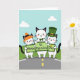 This card shows three white cats with black ears and tails standing together on a gray road marked with short yellow dashes, like they’ve paused for a friendly photo on St. Patrick’s Day 💚. Behind them, a bright green lawn stretches into a calm blue sky with a few puffy white clouds, giving the scene an easy, sunny feel. The left cat wears an orange cone-shaped hat, leaning slightly toward the others as if trying to stay close. In the middle, the cat’s green bow tie draws your eye, and its gentle smile and rosy cheeks suggest a sweet, affectionate bond with its companions. On the right, the cat sports a tall green leprechaun hat with a golden buckle, standing a touch taller like the proud organizer of the moment ☘️. Across their paws are three green signboards that read “Happy St. Patrick’s Day,” with “Happy” on the left, “St. Patrick’s” in the center, and “Day” on the right in lighter lettering. Small golden-yellow shamrocks decorate the “Happy” and “Day” signs, and the hats and accessories pop against the simple sky-and-grass background.