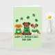 This greeting card shows three cartoon dogs standing close together on a pale green background, their friendly faces turned toward you as if posing for a group photo 💚. The orange-furred dog on the left wears a green sweater with a white shamrock on the chest, leaning in with an easy, buddy-like closeness. In the middle, a brown dog sports a dark green bandana with a shamrock emblem, giving the others a steady, affectionate look that feels like family. On the right, a white-and-light-brown dog wears a green striped sweater, angled slightly toward the center as if sharing the moment with the pair. All three wear oversized green-rimmed rectangular glasses, adding a cute, slightly studious touch that makes them look like best friends ready for a fun day ☘️. Along the bottom edge, the message “HAPPY ST. PATRICK’S DAY! OUR SON” appears in bold sans-serif lettering in dark green, centered and easy to spot. Small shamrocks float above their heads, scattered across the upper area of the soft green backdrop.