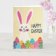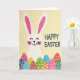 This card features a friendly white bunny centered on a warm buttery-yellow background, with tall ears tipped in bright pink and a gentle, closed-eye expression that feels like a quiet wink between friends 🐰. Soft rosy cheeks and simple facial details keep the character sweet and approachable, like it’s leaning in for a small shared joke. Below the bunny, a cluster of egg-shaped decorations spreads out like a bouquet, mixing stripes, dots, and wavy lines in pinks, blues, greens, and yellows 🌷. The eggs overlap slightly, creating a cozy, togetherness feel, as if they’ve been gathered and arranged with care for someone special. On the right side, a short seasonal greeting appears in plain, easy-to-read letters, set in a darker color that stands out against the yellow. The message sits around mid-height, leaving plenty of open space so the bunny and eggs remain the main focus. The bunny’s ears show a bright fuchsia-like inner detail, and the egg patterns include alternating bands and scattered polka dots.