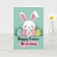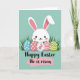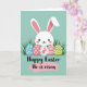 This card features a sweet white bunny with pink-lined ears, tiny black dot eyes, and rosy cheeks, standing calmly as if sharing a quiet moment with the viewer 🐰. In front of the bunny sit five decorated eggs nestled in thin green grass, arranged close together like a small gift between friends. The eggs include a soft blue one with small white flowers, a gentle pink one with matching floral details, and a white one dotted with a simple bunny silhouette. Next are a pink-and-white striped egg and another with green zigzag lines, adding variety while keeping the palette soft. The background is a muted teal that feels like early spring air, letting the bunny and eggs stand out without being loud 🌷. Near the bottom, a short greeting appears centered in black cursive-style lettering, with a light pink underline stroke beneath it. The bunny’s relaxed posture and the cozy cluster of eggs create a tender, friendly scene. The grass blades rise around the eggs in fine strokes, and the teal backdrop stays smooth and uncluttered.
