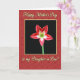 Designed with a rich floral theme, this greeting card centers on a single star-shaped flower set against a deep black panel, drawing the eye like a quiet gift of affection ❤️. The petals are deep red with thin white stripes that angle inward toward a bright yellow-green center, where fine stamens add a soft, intimate detail. Around that central panel, a warm ruby-red background shows a faint pattern of tiny star-like blossoms, creating a gentle, companionable backdrop. A slim yellow border frames the black center like a neat window, adding contrast without feeling harsh. Near the top, “Happy Mother’s Day” appears in flowing gold lettering, placed above the flower so it feels like a warm greeting being spoken. Near the bottom, “to my Daughter in Law!” sits in matching gold, balancing the layout and giving the message a tender, family-forward tone 🌼. The overall color pairing of red, gold, and yellow-green suggests closeness and appreciation through the way the elements lean toward the center. The black center panel is surrounded by a narrow yellow frame, and the outer red area is dotted with small, repeating floral shapes.