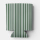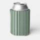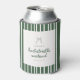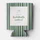 Striped Green Coquette Bow Bachelorette Weekend Can Cooler. Modern and elegant bachelorette weekend party can coolers, designed with script lettering, an olive green striped pattern, and a coquette bow and aesthetic. Personalize with your bachelorette location, and the bride's name.