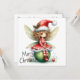 Celebrate the season with a whimsical holiday design featuring a cheerful Christmas fairy perched on a green ornament trimmed in white fur. Dressed in a red and white striped dress, matching stockings, and a Santa hat adorned with holly, she radiates festive joy with translucent wings and playful charm. Snowflakes, holly leaves, and berries surround the scene, creating a magical blend of fantasy and tradition. The message “Merry Christmas” adds a warm touch to this enchanting illustration. On the reverse side, a heartfelt greeting is included with the sender’s name, offering a personal and joyful message perfect for sharing holiday cheer with loved ones. Ideal for those who adore imaginative design and seasonal sparkle.