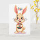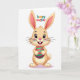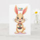 This card features a cheerful, human-like bunny centered on a bright white background 🐰. The bunny is shaded in pale tan and cream, with big purple eyes, rosy cheeks, and a small pink nose that gives it a sweet, friendly look. Its long ears rise up with warm pink on the inside, framing a wide smile with two front teeth that feels like it’s meant for someone close. Soft, diffused lighting adds gentle depth to the rounded face and paws, creating a cozy, affectionate mood without any busy scenery. Held carefully in its paws is an oval egg decorated with alternating fuchsia and emerald-green stripes, dotted with small red spots for extra texture. Near the top, a short holiday greeting appears in multi-colored letters—green, orange, red, and purple—set above the character so it reads first. The egg’s glossy stripes and the bunny’s fluffy white tail are the main details that stand out against the plain white space 🐇.