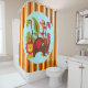 Ein niedlicher Duschvorhang für Kinder, die Zootiere, Safaritiere und Dschungeltiere Liebe, mit orangefarbenen, weißen und braunen Streifen mit einem blauen Rundschreiben mit Dschungel-Pflanze, Giraffe, Löwe und Elefanten!