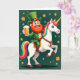 This St. Patrick's Day card shows a cheerful leprechaun riding a white unicorn against a deep emerald green background sprinkled with golden four-leaf clovers and tiny starbursts. The leprechaun grins wide with rosy cheeks and bright blue eyes, and his fiery orange beard stands out against his neat green suit and tall hat with a gold buckle. He lifts a frothy pint of golden ale as if toasting a close friend, leaning forward with an easy, companionable confidence. The unicorn looks back with a gentle smile and soft blue eyes framed by long lashes, giving the pair a sweet, in-on-the-joke closeness. A rainbow mane and tail flow in smooth bands from pink to purple, adding a little 🌈 magic to the scene. Near the top, St. Patrick’s Day words sit in light gold lettering that contrasts clearly with the green, with a small ☘️ tucked nearby. Gold clovers dot the space around them, and the unicorn’s spiraled golden horn gleams at the center of its forehead.
