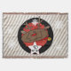 Die schöne Weihnachtsbaumdecke mit einem niedlichen Rentier mit roter Nase auf grauem Hintergrund mit weißen diagonalen Streifen, einem schwarzen Streifen mit einigen weißen Schneeflocken und einem roten Zentrum mit weißen Polka-Punkten.