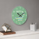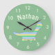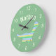 Grüner und blauer stripy Cartoondinosaurier auf personalisierter Wanduhr des niedliches Kindes.