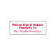 Dieses Briefmarke Design beinhaltet die Nachricht "Bitte signieren & zurücksenden" und eine Zeile, die oben eine Signatur oder Initialen schreiben könnte. Es enthält auch einen benutzerdefinierten Pädagogen oder Tutor-Namen. Es könnte von einem Lehrer, Tutor oder Erzieher genutzt werden, um die Eltern oder Vormund eines Schülers fragen, die Note zu überprüfen und anzuerkennen, die ein Schüler für ein Projekt, einen Test, einen Aufsatz, eine Arbeit oder eine andere Schulaufgabe got.