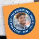 Runde Rücksendeadressen-Aufkleber mit Ihrem Foto umgeben von einem dunkelblauen Rahmen mit Ihrem Namen und Ihrer Adresse in einem Uni Sport-Schriftart. Farben sind im Designwerkzeug anpassbar.