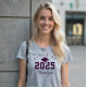 Fun varsity-style grad T - Shirt mit dem Abschluss Jahr in großer Zahl mit der "class of" in einem Arch-Design oben angezeigt. In der Mitte befinden sich ein Graduiertendeckel und eine Tassel, die mit dem Namen des Absolventen personalisiert sind. Es ist ein großes personalisiertes Sake-Geschenk für den Absolvent.