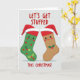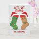 Above the stockings, in bold red letters, it says 'LET'S GET STUFFED,' a funny nod to holiday feasting. At the bottom, it adds 'THIS CHRISTMAS!' to set the seasonal tone. Shadows underneath the stockings add depth. The design is simple but impactful, blending classic holiday themes with a modern twist. It's a charming card that brings a warm, festive feel perfect for spreading holiday cheer. 🎅🏼🎄🎁 Share this card to spread the joy of the season!