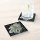Beautiful glass coasters with fractal artwork of a single white lily framed in silver.