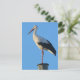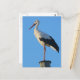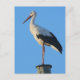 Weißer Storch am elektrischen Pol auf dem Hintergrund des blauen Himmels.