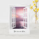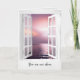 Der Himmel stürmt mit einem Blitz über rosa Wasser in einem weißen offenen Fenster mit schieren Vorhängen. Alle Texte können bearbeitet werden.