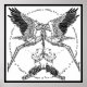 Fantastische Illustration von Dugald Stewart Walker aus dem Kinderbuch "Fairy Tales von Hans Christlich Andersen", erschienen 1914. Schwarz-Weiß zeichnend von zwei Störchen im Flug, ihre Hälse überquert, mit zwei Säulenhaltern, umgeben von einem Ring von Sternen. Aus der Geschichte "Der Flying Trunk".
