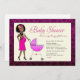 Diese stilvollen Babyduschen-Einladungen sind mit einer Afroamerikanerin ausgestattet, die eine leoparden Druckjacke trägt und eine rosa Babywagen mit einem subtilen rosa Tierdruck schiebt! Bereit zum Anpassen und Kauf!