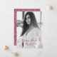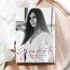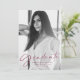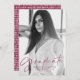Moderne Abschluss-Ankündigung mit dem vertikalen Foto des Absolventen mit "Graduate" in einem stilvollen Maroon-Skript-Overlay. Personalisieren Sie die Titelseite der Ankündigung des Foto Abschluss, indem Sie den Namen des Absolventen, den Schulnamen und das Abschluss Jahr. Auf der Rückseite der trendigen Abschluss-Ankündigung befindet sich ein handgezeichnet Maron und Weiß-Muster.
