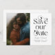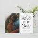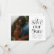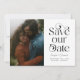 Elegante und stilvolle Save the Date-Karte mit Typografie-Text, auf der steht "rett unser Datum" mit deinem Foto. Sie können einen QR-Code auf der Rückseite hinzufügen, der auf Ihre Hochzeitswebsite verweist.
