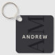 Dieser stylische blaue Schlüsselanhänger zeichnet sich durch ein modernes Layout mit vertikalen Monogrammen im Großformat aus, und Ihr Name in einem schlichten, cremig weißen horizontalen Typ.